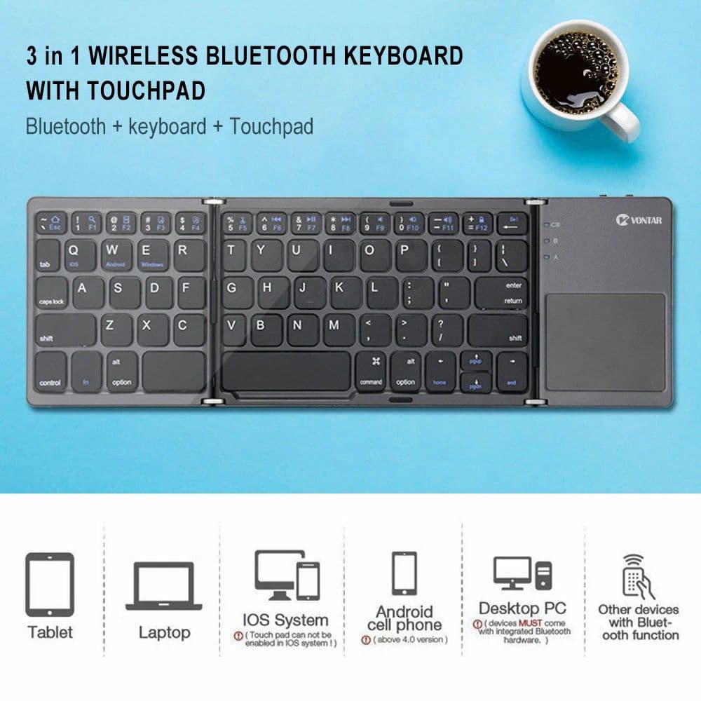 Складная клавиатура Vontar с тачпадом – уникальное решение для обладателей ТВ-приставки, путешественников, журналистов и любителей полноценной раскладки QWERTY. Складной гаджет по размерам напоминает клавиатуру компактного ноутбука. Имеет мягкий ход клавиш и не шумит.